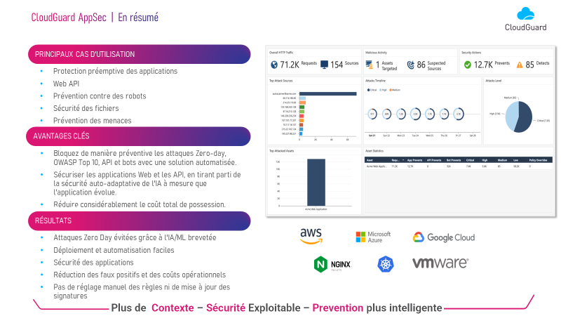 Check Point CloudGuard AppSec vous permet d’automatiser la sécurité des applications et la protection des API grâce à l’IA contextuelle. Bloquez les attaques contre les applications Web grâce à une sécurité des applications entièrement automatisée et native du cloud. CloudGuard AppSec protège en continu les applications à mesure qu’elles évoluent à partir de tous les 10 principaux risques de sécurité des applications Web de l’OWASP. Le moteur d’intelligence artificielle de la solution s’adapte en permanence aux changements d’application et aux mises à jour automatiques pour assurer une sécurité continue. CloudGuard AppSec empêche automatiquement les criminels d’exploiter les API pour exposer des données sensibles, injecter des commandes ou extraire des clés API. CloudGuard AppSec utilise l’analyse comportementale pour faire la distinction entre les interactions humaines et non humaines avec les applications, pour empêcher le credential stuffing, les attaques par force brute et le scraping de site, et offre une protection personnalisable pour gérer les robots Web non malveillants.