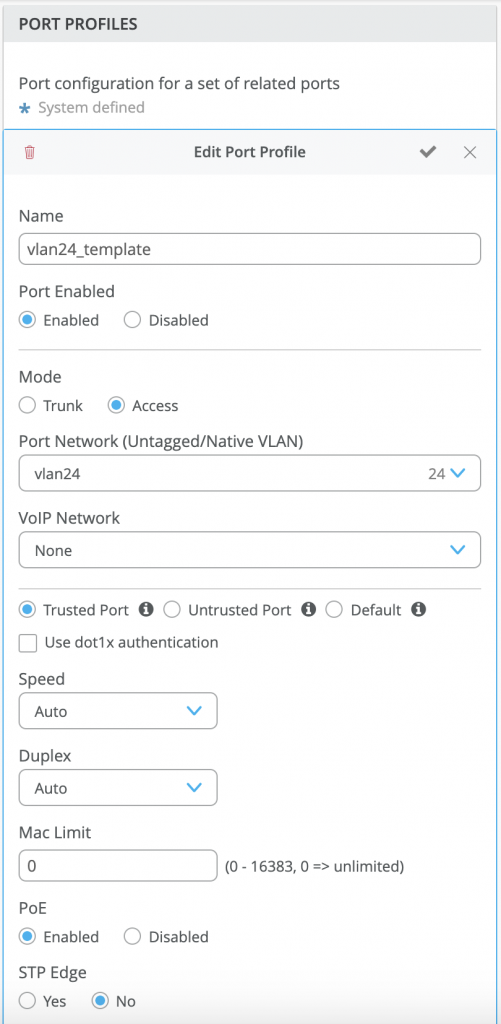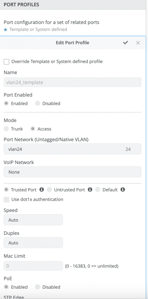 Pour le Access port_profile, nous avons les options pour le rendre Trusted et Untrusted. S’il n’est pas défini, il sera sur Par défaut. Le port _network peut être un réseau simple ou un réseau VoIP.