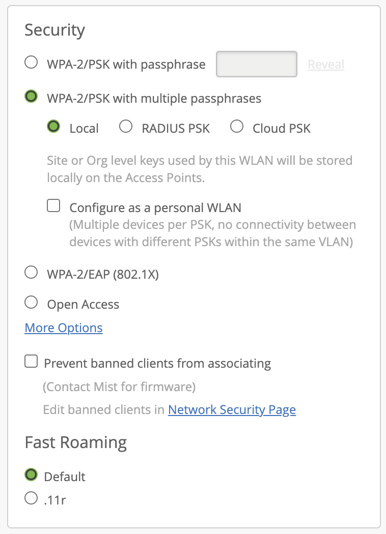 Choisir le SSID pour configurer les options Security (WPA-2/PSK with multiple passphrase : Local les PSK sont stockés sur l’AP, Radius PSK sur un serveur radius et Cloud PSK qui sera stocké sur le cloud Mist) et VLAN (les VLAN concernés).