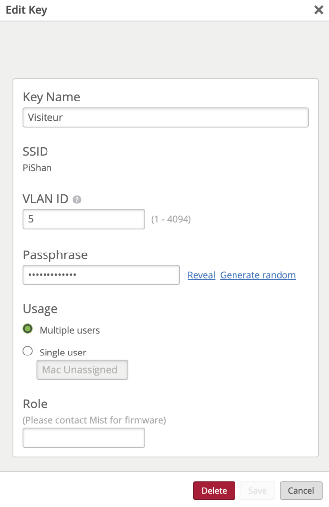 Toujours sur le dashboard dans Site > WLANs > Security sur le SSID concerné indiquer les clefs et les VLANs associés pour un seul utilisateur (basé sur la mac adresse) ou un groupe d’utilisateur.