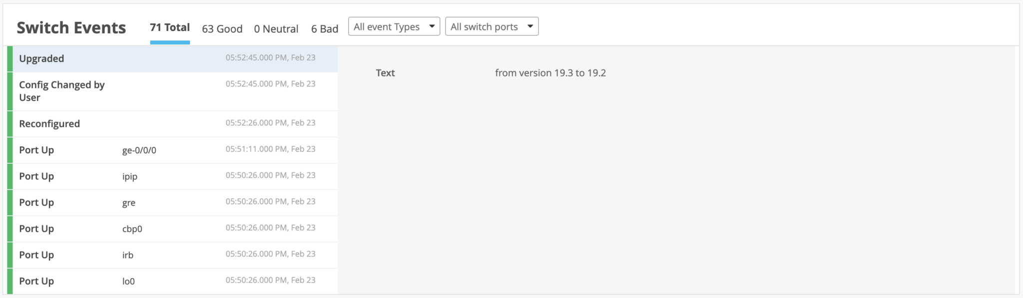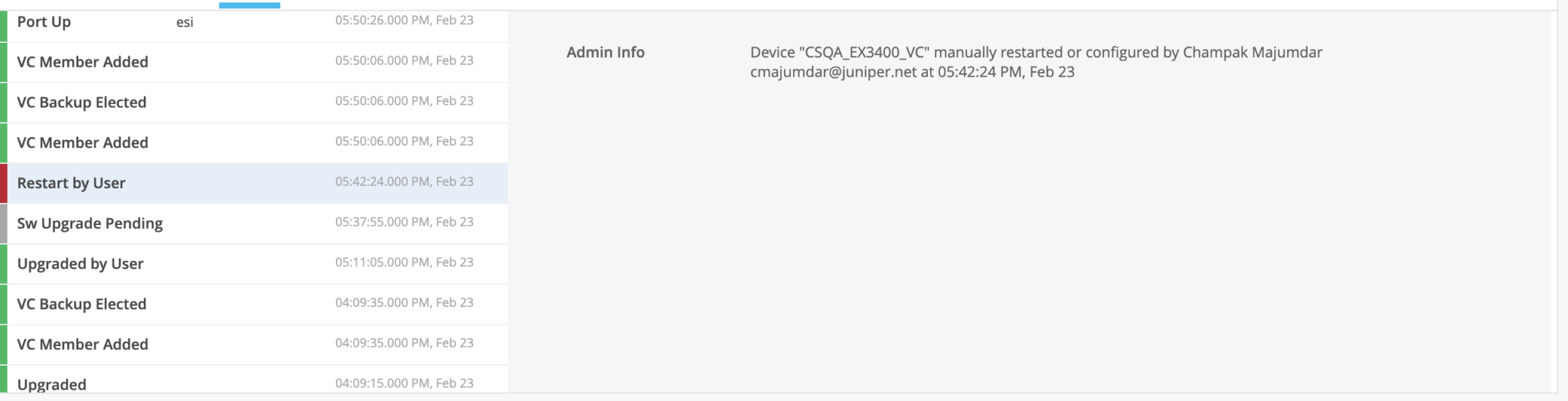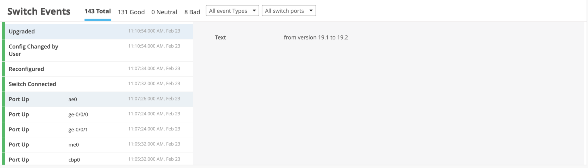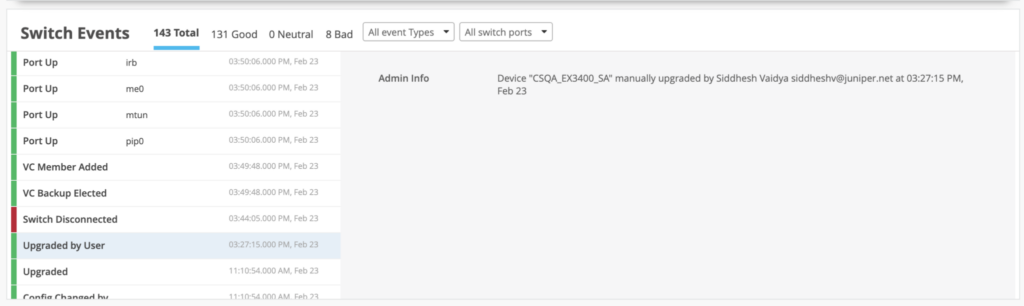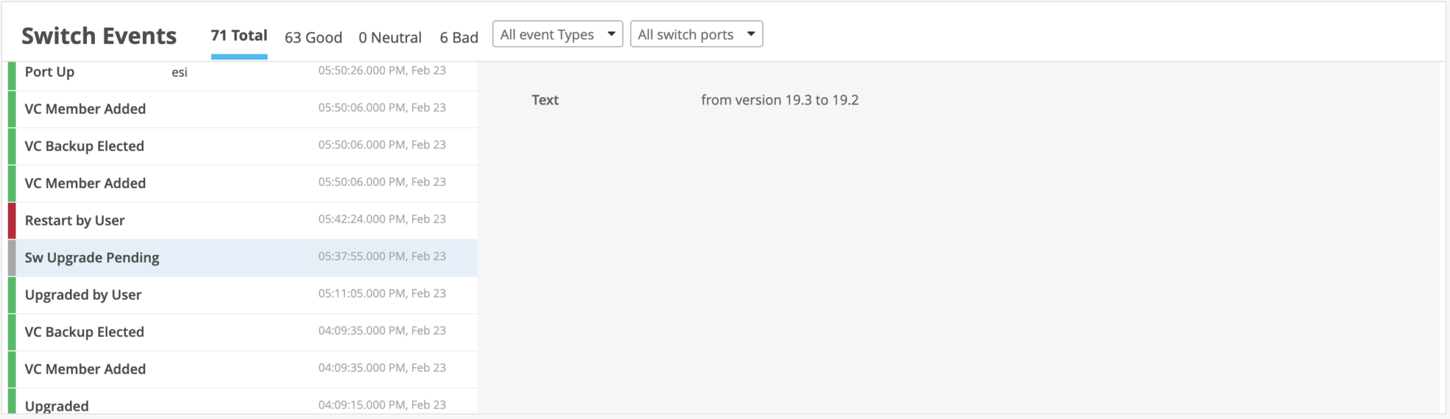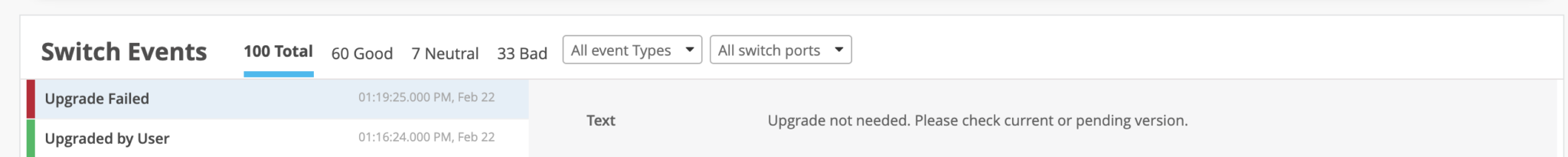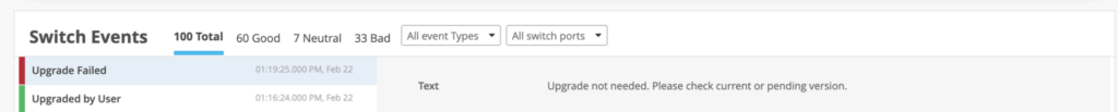 Une fois le commutateur mis à niveau, les événements mis à niveau sur l’interface utilisateur sont visibles :