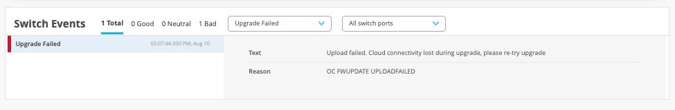 a) Upload Fail : lors d’une mise à niveau du commutateur, s’il y a une déconnexion SSH ou un bagot de port de liaison montante, le téléchargement du commutateur échouera et cela sera également affiché sur la page des événements Switch Insights :