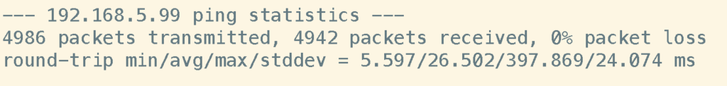 Une fois la mise à jour terminée, on peut vérifier sur une machine qui était connectée aux switches ayant effectués le NSSU en ayant lancé un ping vers l’irb qu’on a eu aucune perte de packets :