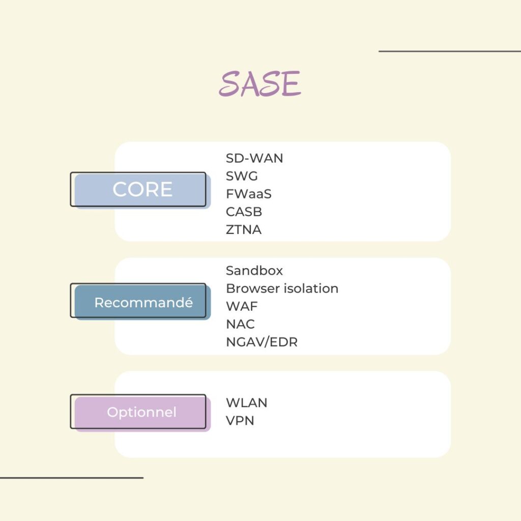 Depuis 2020 et la crise du covid, il y a une forte demande pour la sécurité et un accès direct au cloud sans avoir le goulot d’étranglement central et la latence d’un VPN traditionnel. SASE tente de résoudre ce problème en combinant Security as a Service et Network as a Service. Gartner a défini trois niveaux pour mettre en place une solution SASE avec ses composantes :