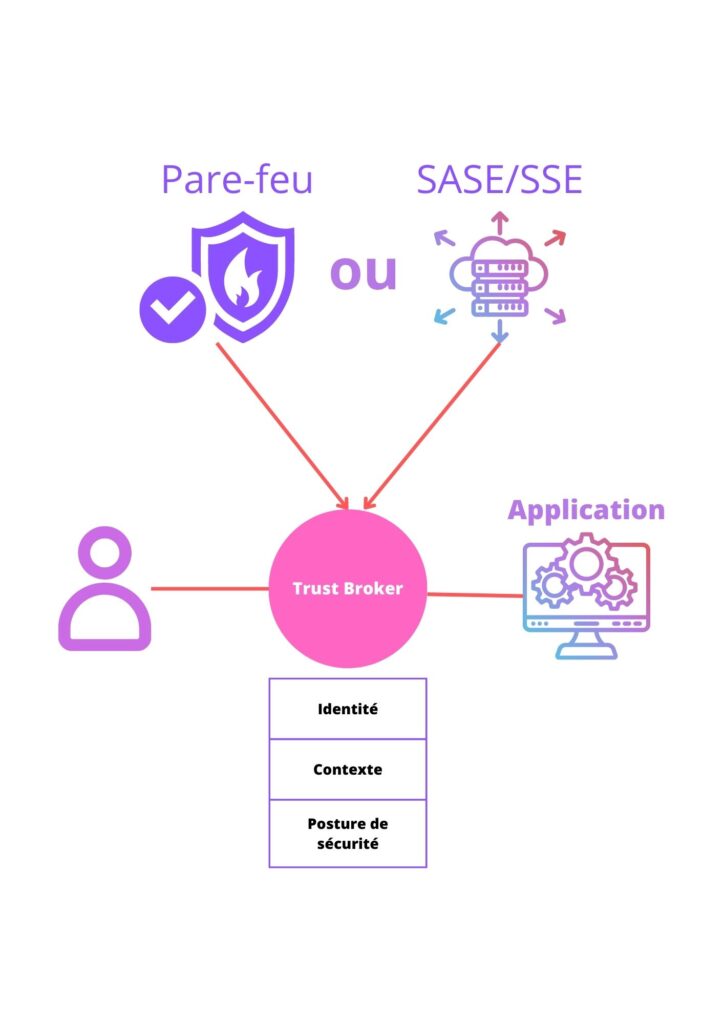 ZTNA est la technologie par laquelle les principes de ZTS peuvent être utilisés pour sécuriser l’accès aux applications et aux ressources. Le cœur de la technologie qui permet les principes de Zero Trust s’appelle le Trust Broker. Cet élément se trouve entre l’utilisateur et l’application, le Trust Broker fournit des limites d’accès logiques et adhère aux principes de Zero Trust ; ce qui veut dire que le Trust Broker est responsable de la vérification de l’identité, du contexte et de la posture de sécurité. Une fois vérifié, une connexion est établie entre l’utilisateur et l’application spécifique demandée et sera surveillée en continue sur les changements apportés pendant le cycle de vie de la session. Le Trust Broker peut être un pare-feu dans un datacentre ou un fournisseur cloud; si vos applications et les ressources sont accessibles via SASE ou SSE, le Trust Broker est le fournisseur cloud lui-même.